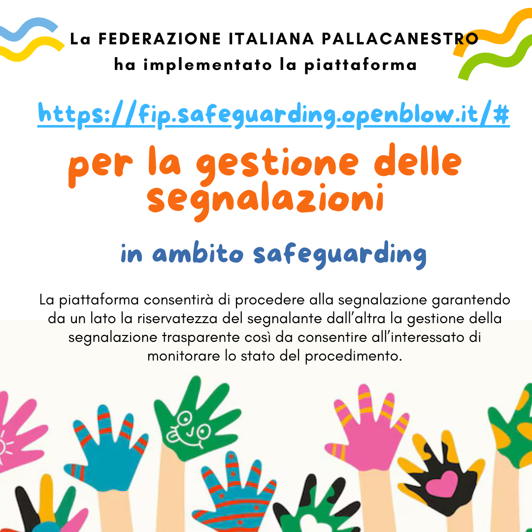 la Federazione Italiana Pallacanestro, facendo seguito alle precedenti circolari in tema di politiche di Safeguarding, e in adempimento a quanto previsto dalle linee guida, è lieta di comunicare l’implementazione di una piattaforma per la gestione delle segnalazioni al seguente link: https://fip.safeguarding.openblow.it/#/, pubblicato altresì sul sito federale nella sezione – Safeguarding, che vorrete riportare nel sito web di ogni società e associazione sportiva affiliata assicurandone comunque la massima diffusione tra i propri tesserati.